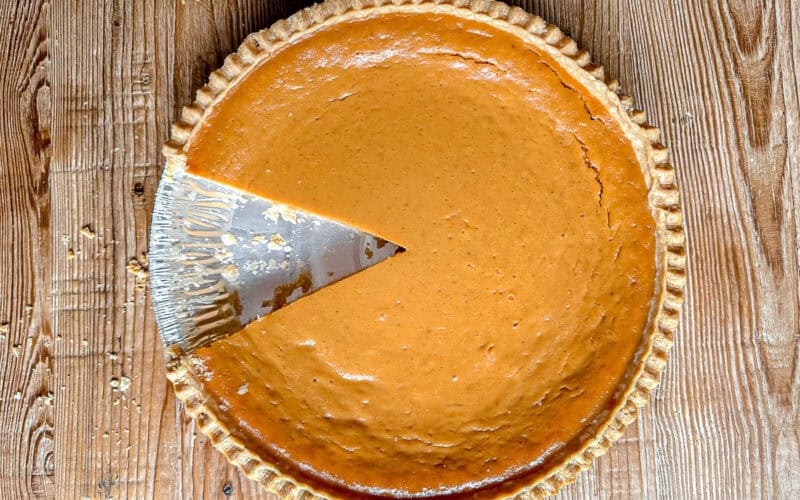 Start with a cold store-bought pumpkin pie (mine is the famous 58 ounce Costco pumpkin pie.) Take a paper towel and lightly blot up any condensation on the surface.