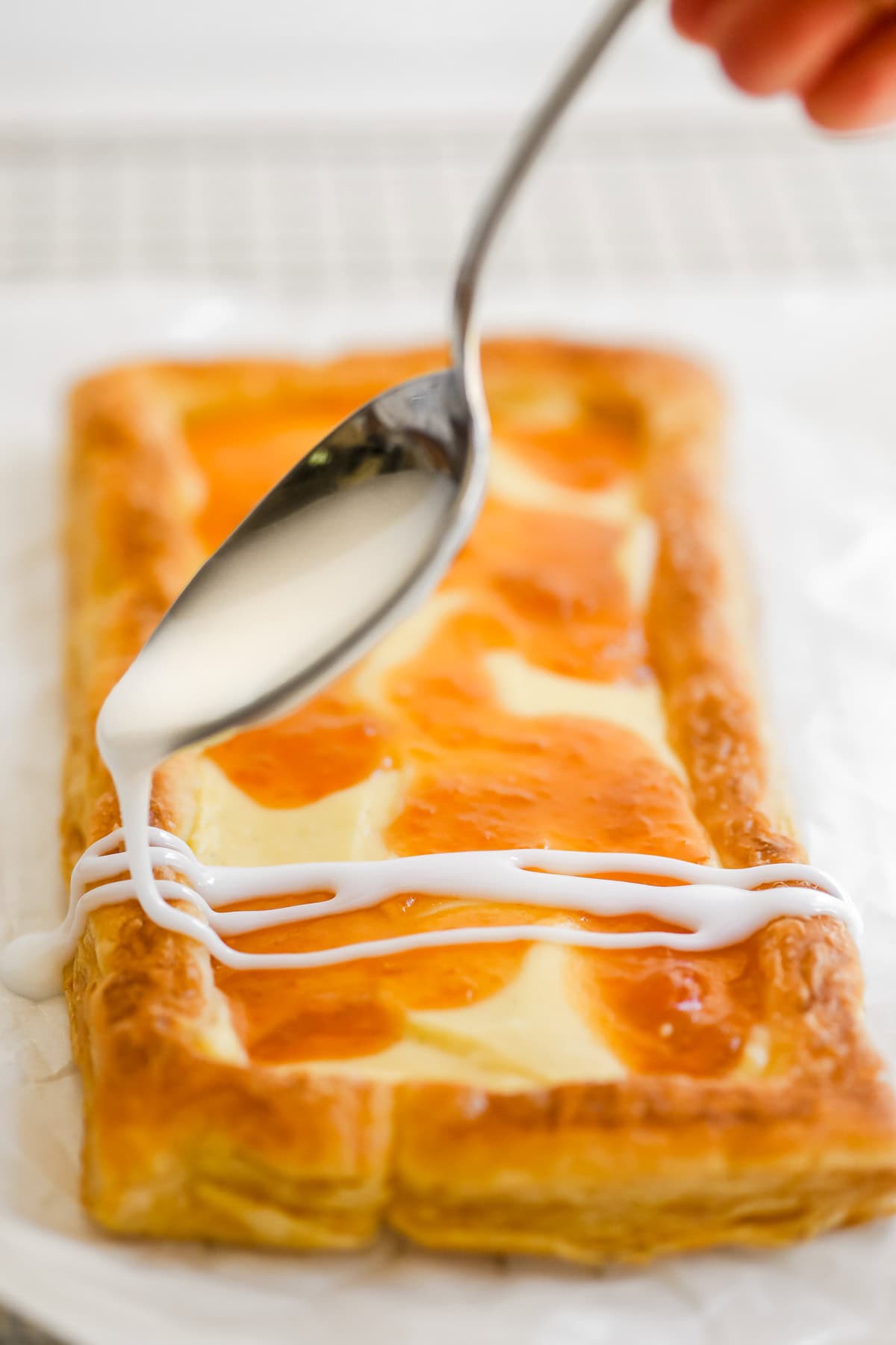 - With about 4-5 spoonfuls on each pastry, dollop the 2/3 cup apricot jam or preserves across the top of the cream cheese filling. You can swirl it very slightly if you like.