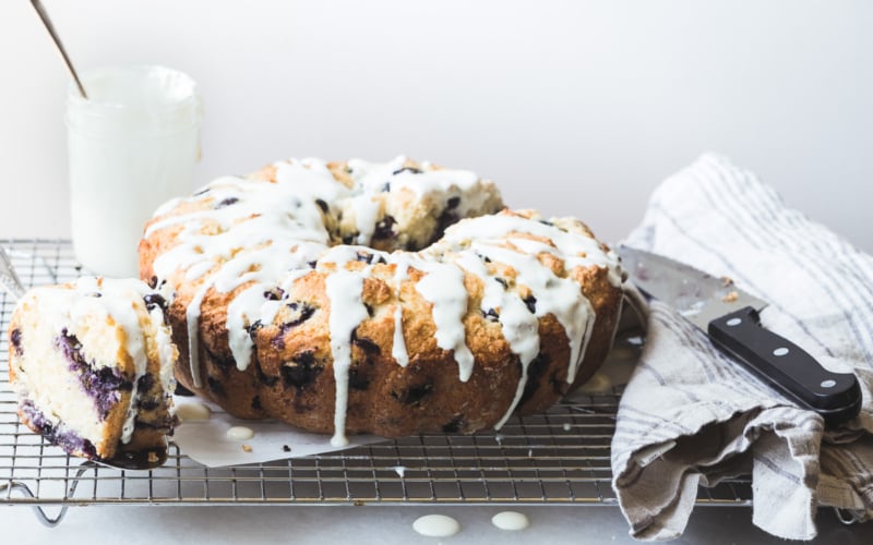 Why fuss with all those individual muffin tins and liners when you can bake it all up into one glorious blueberry breakfast cake? I admit I’ve got a crazy little obsession for bundt cakes going on lately, specifically bundt cakes that take their cues from other breakfast type treats…remember that Apple Cider Doughnut Bundt Cake? Or the Glazed Old Fashioned Doughnut Bundt Cake? Once you go down this road it’s hard to turn back…trust me.