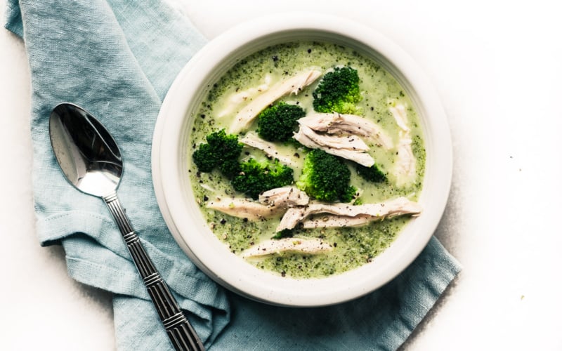 - Ladle the soup into bowls garnished with the reserved broccoli florets and shredded chicken. Give each bowl a shower or Parmesan cheese and fresh cracked black pepper and dig in.
