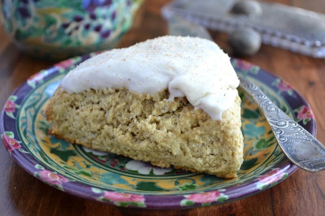 - For the glaze, Combine the sugar, spice and extract and add just enough milk or cream to create a glaze. You can turn the scones upside down and dip them right into the glaze, spread it on with a knife, or drizzle it. Dust the finished scone with a little nutmeg or with whatever spice you’ve chosen to flavor your glaze.