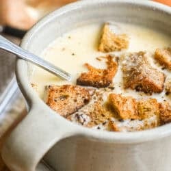 - Serve the soup in small bowls or mugs topped with the croutons, some coarse black pepper, and a grating of nutmeg.