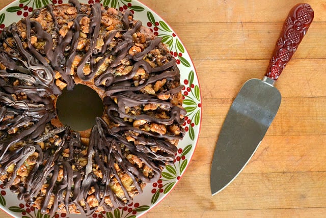 I tasted this cake many years ago and have held onto the memory and the recipe. It’s from Bon Apetit 1995. The cake is safely under glass and waiting for the first daughter to arrive home today for the holidays.