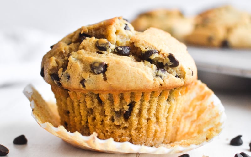 Peanut butter muffins studded with mini chocolate chips – what could be better? These muffins are extra soft and moist and couldn’t be easier to whip up!