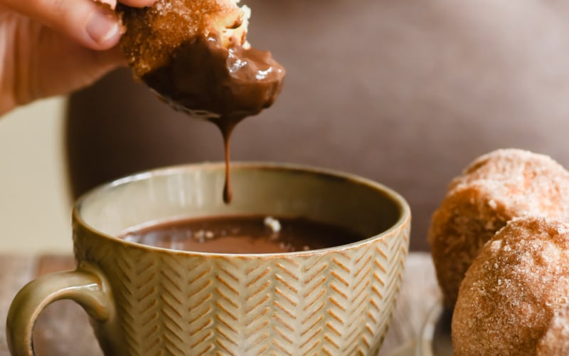 I can’t lie, the hot chocolate sauce is the star of the show, and so easy to make. I heat half and half or cream with a little cornstarch in a small saucepan until it’s just starting to steam, then add the chocolate and cook until thick and glossy. It’s like drinking chocolate meets ganache meets chocolate pudding. Double dipping your churro muffins is encouraged!