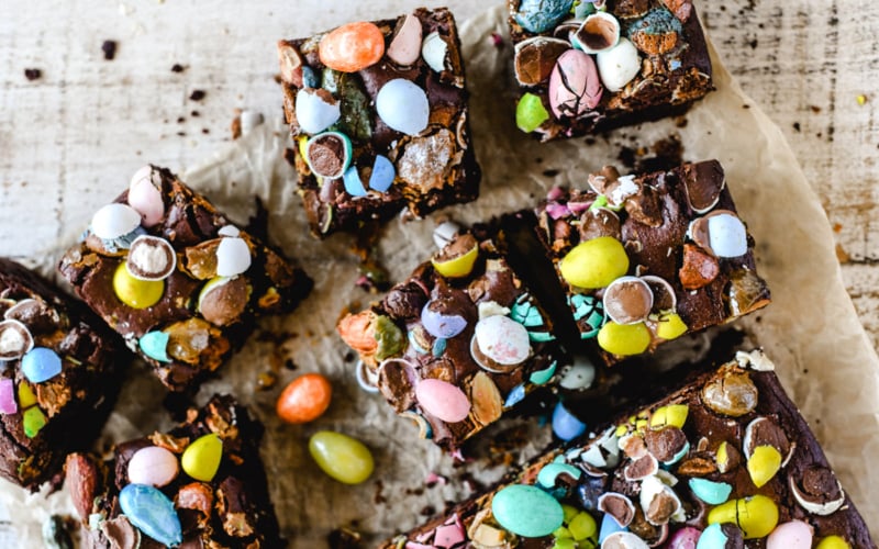 Sometimes dessert just doesn’t feel like dessert unless it’s chocolate, you know what I mean? And this yummy Easter dessert makes good use of all those chocolate eggs you’ve probably got lying around. I’m not trying to micromanage or anything, but I highly suggest you take said eggs, give them a quick bash with a rolling pin or other heavy object, and use them to top a batch of these amazing brownies.
