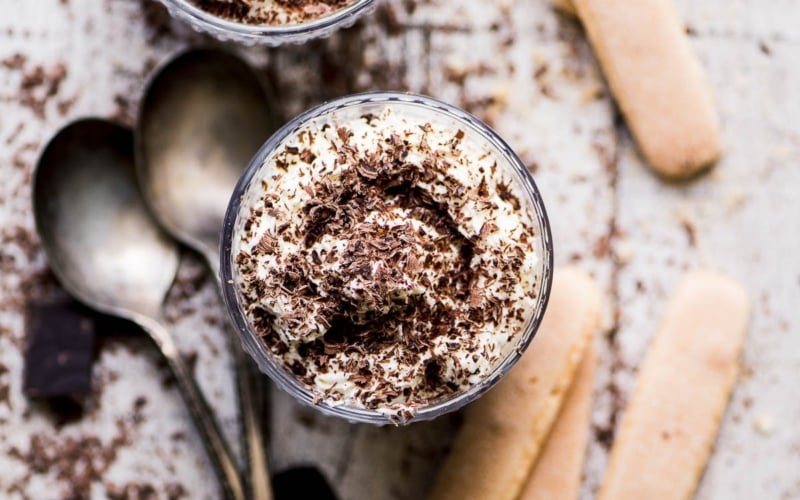- Top each layer of soaked biscuits with a spoonful of the mascarpone/cream mixture. Top with a second layer of dipped cookies. Top with more cream, then a last layer of soaked cookies and a final topping of cream. Finish off with a generous amount of shaved chocolate. Note: if you love chocolate, feel free to add chocolate shavings to each layer.