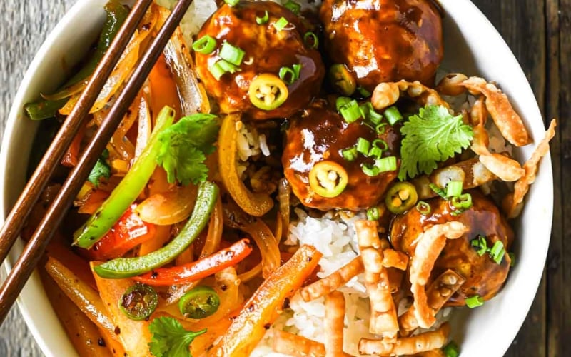 My husband and I were huge Panda Express fans when we lived in Los Angeles. We’d scout out the best locations and go hoping to time our visit to coincide with a fresh refill of one of our favorites at the counter. Like Firecracker Chicken. Yes it’s American meets Chinese with the emphasis on American, but we loved it. When we moved to Madison the only local Panda location closed the same year. The heartbreak was real. But since then I’ve been on a mission to recreate a bunch of Panda Express classics. Of course I did Firecracker Chicken. I’ve even done Firecracker Chicken Lettuce Wraps. And now my latest, Firecracker Chicken meatball bowls. I’m on a roll and I’m not stopping.