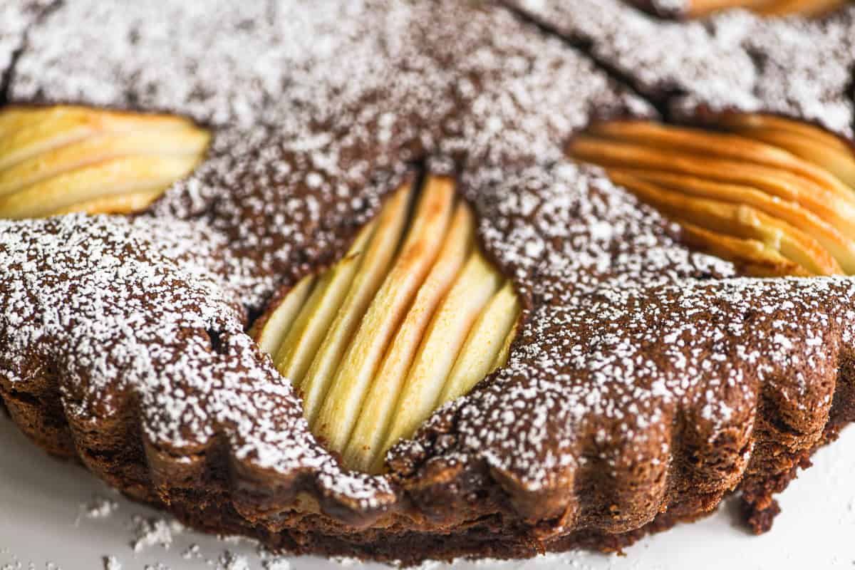 My gluten free chocolate almond pear cake is a melt-in-your-mouth flourless chocolate cake topped with thin slices of juicy pear