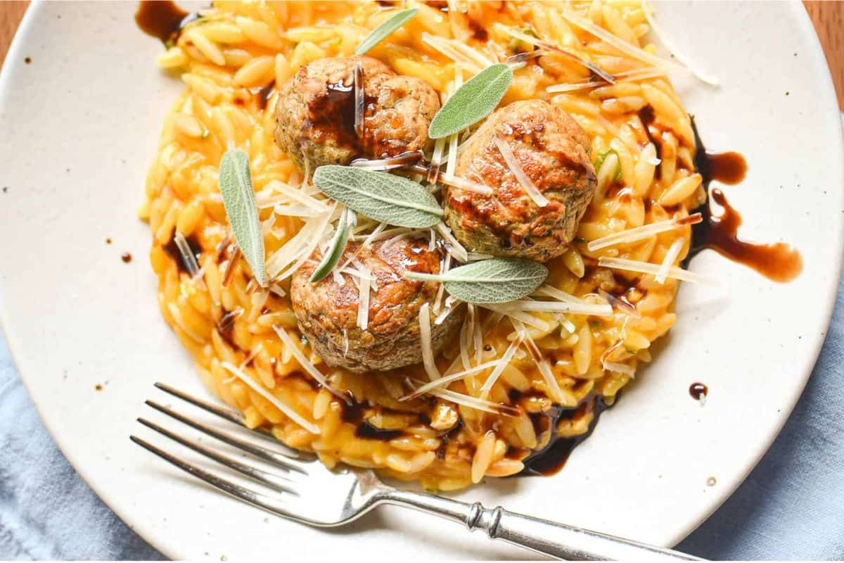 Cheesy Pumpkin Orzo with Turkey Meatballs