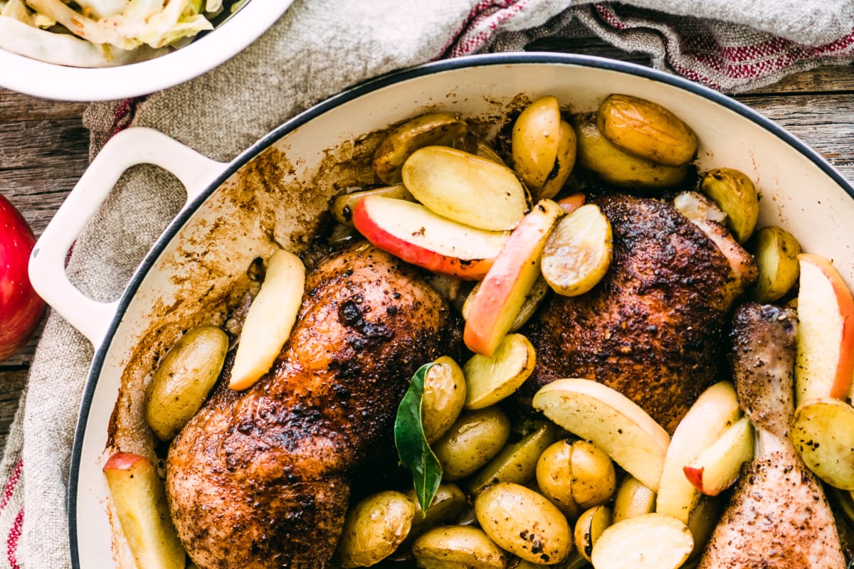 Roast Chicken with Potatoes, Apples and Brown Cabbage ~ this cozy Scandinavian chicken dinner recipe is the ultimate hygge meal