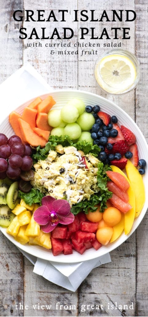 My Curried Chicken Salad Plate has a definite tropical spring break vibe with a tumble of colorful mixed fruit anchored by a big scoop of curried chicken salad. This summer main course salad is paradise on a plate.