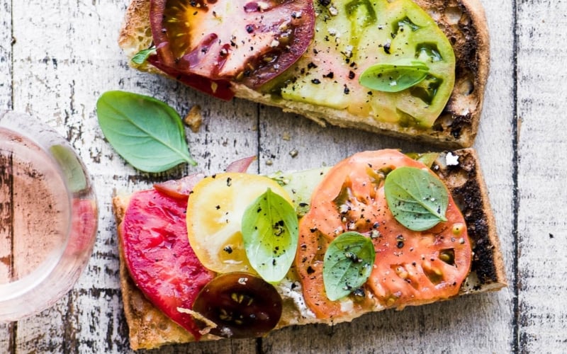 You can use regular red tomatoes for your toast, but this is a perfect way to showcase colorful heirlooms. The more different shades the merrier!