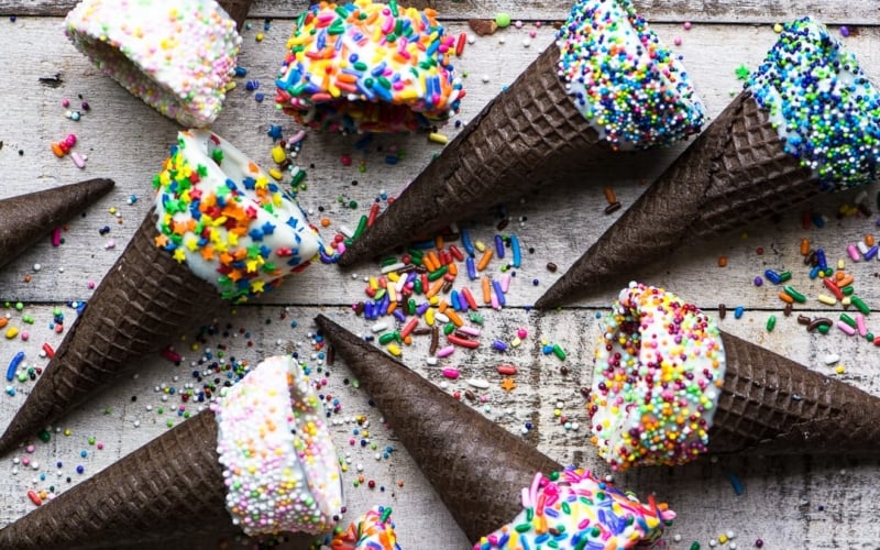 - You can make sprinkled ice cream cones with regular sugar cones, too, just use milk or dark chocolate, and melt and decorate in the same manner.