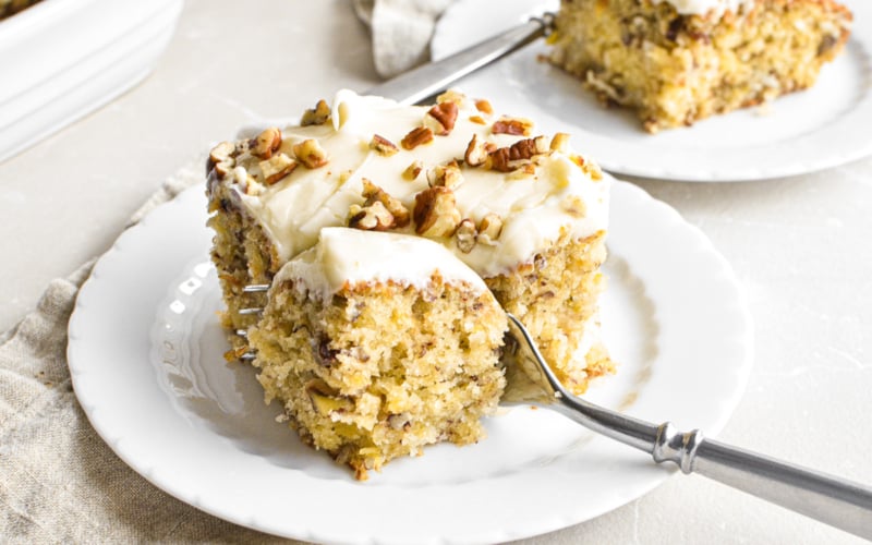 The cake is rich with crushed pineapple, ripe bananas, and pecans, with a unique flavor profile that combines elements of banana bread, carrot cake, and pineapple upside-down cake. And, of course, that insanely delish cream cheese frosting. Mine has a couple of secret ingredients thrown into the mix.