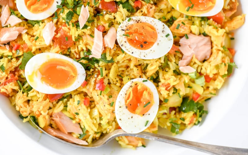 Kedgeree is classic British comfort food made with basmati rice, smoked salmon, soft cooked eggs, and lots of herbs and spices — it’s versatile enough to eat for breakfast, brunch, lunch, or dinner!