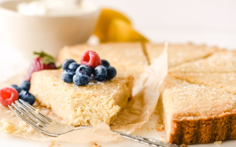 I cooked my shortbread in a tart pan, but you can also use a square baking pan, or roll and cut the dough into cookies. My slices, above, are super generous, you could easily get double the servings from this recipe.