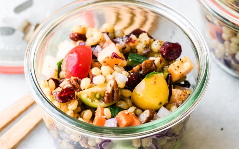 Like other grain salads, this one keeps well for days in the fridge. The grains of wheat soak up the dressing and it gets more flavorful as it sits. I like to pre-pack it in glass jars to grab and go whether you head out to work every day, or just to your home office.