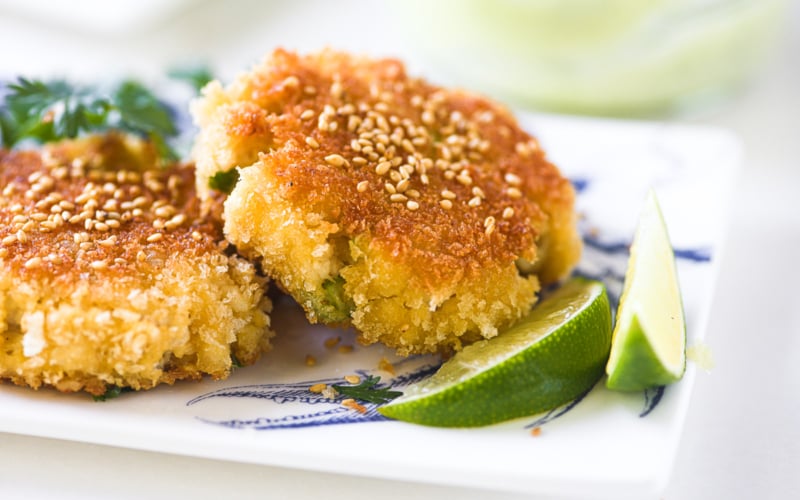 Mini crab cakes with ginger and scallions is a Japanese inspired appetizer or light meal. They’re super crispy on the outside, tender and meaty inside ~ a hint of fresh ginger and lime makes them irresistible!