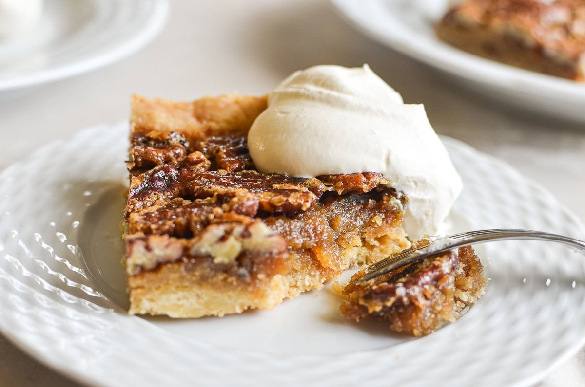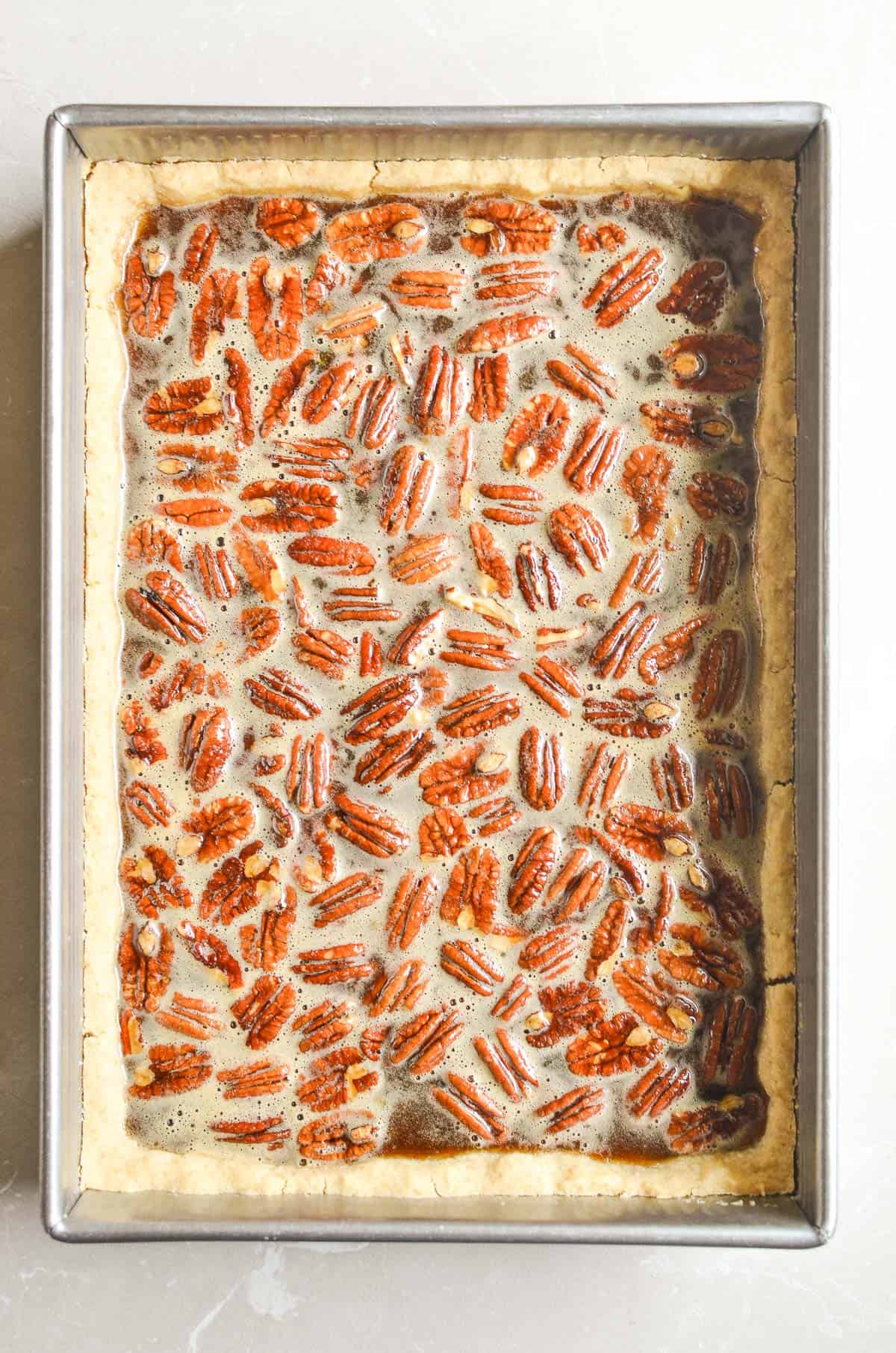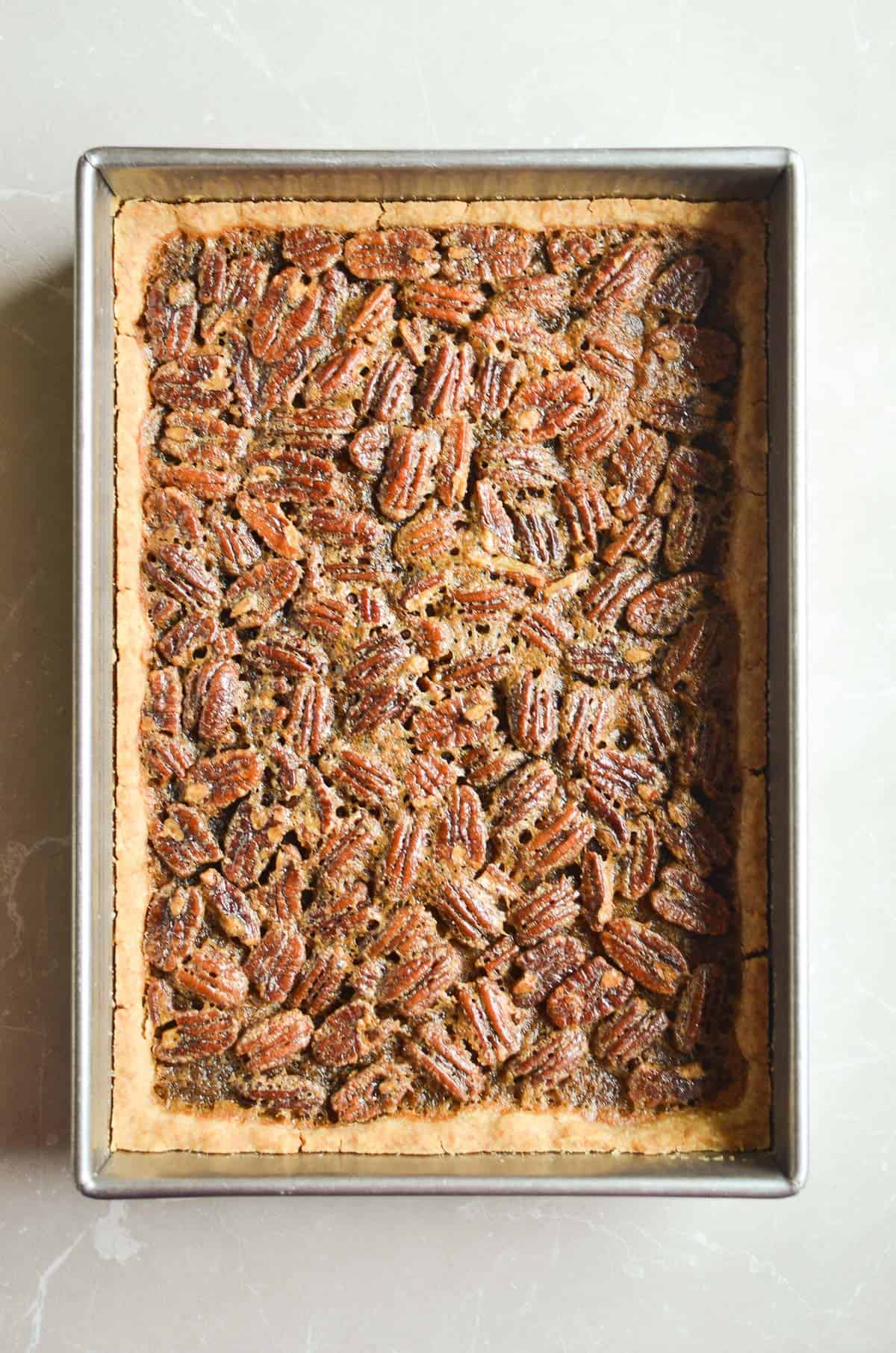 I replace corn syrup with maple syrup in these pecan pie bars and it’s soooo good. The flavor is better and more complex, and pairs perfectly with pecans. Corn syrup traditionally makes for a smooth, thick filling in pecan pie, and to replicate that, we use maple syrup plus a little cornstarch dissolved in water since maple syrup is usually thinner than corn syrup.