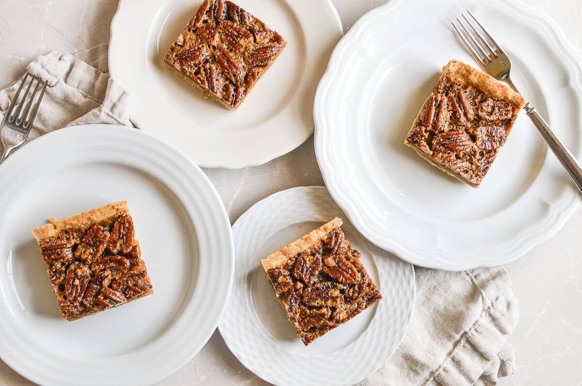 These pecan pie bars are sweetened with maple syrup (no corn syrup!) and built on an easy press-in crust for a fresh take on the classic ~ all the cozy pecan pie flavor, none of the fuss.