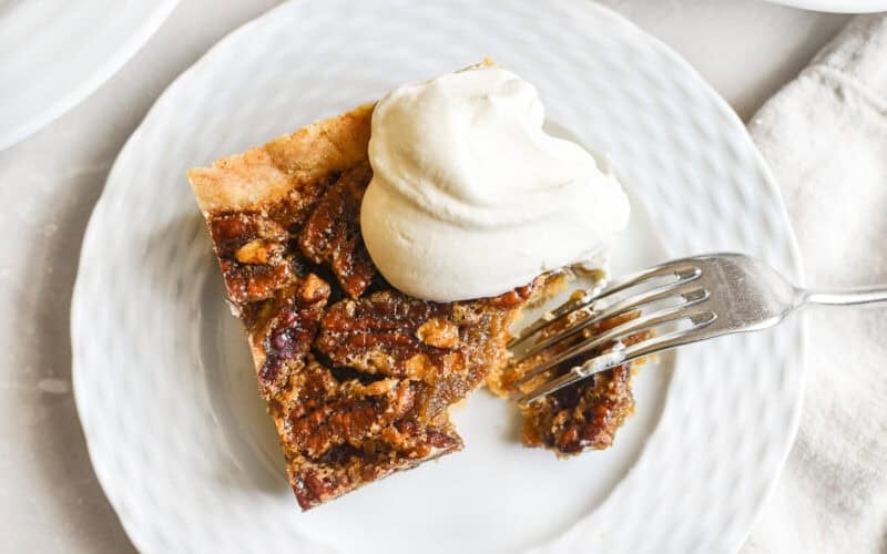 I replace corn syrup with maple syrup in these pecan pie bars and it’s soooo good. The flavor is better and more complex, and pairs perfectly with pecans. Corn syrup traditionally makes for a smooth, thick filling in pecan pie, and to replicate that, we use maple syrup plus a little cornstarch dissolved in water since maple syrup is usually thinner than corn syrup.