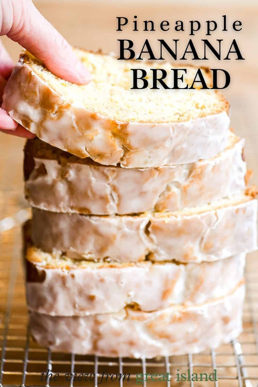 This Pineapple Banana Bread is an easy tropical treat ~ ripe bananas, crushed pineapple, and shredded coconut make for a dreamy loaf cake, and don’t forget that sweet/tangy pineapple glaze!