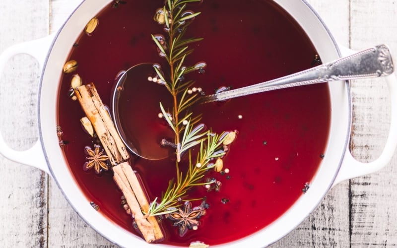 - Put the juices in a large pot, or slow cooker. Add the rest of the ingredients and bring up to a simmer. Turn down the heat and let steep for at least an hour.