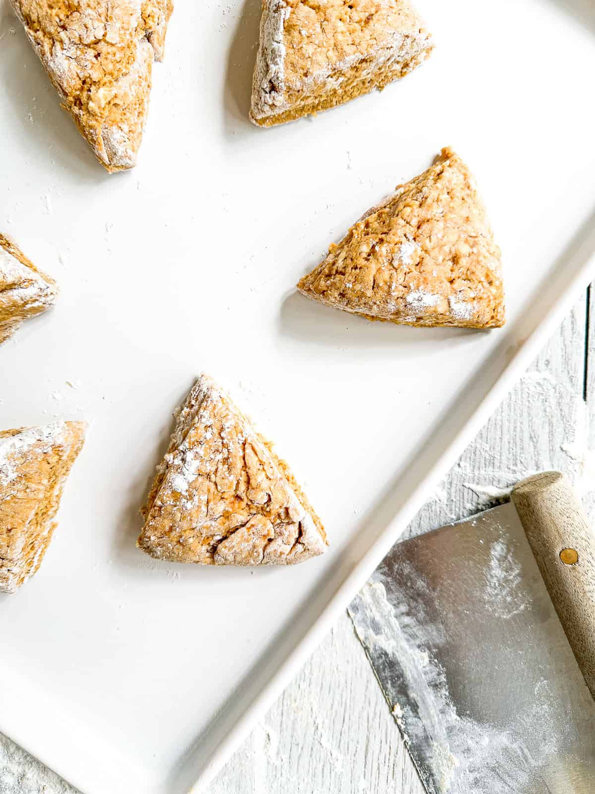 - Turn the dough out onto a floured surface and bring it together into a 6 inch disk with floured hands. Cut the disk into 6 triangles, and place the scones on your parchment lined baking sheet.