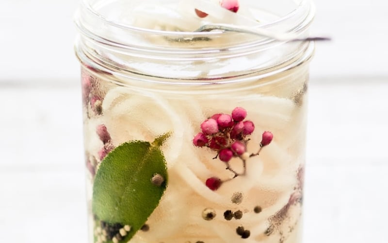 - Heat the vinegar, water, and spices in a saucepan over high heat until it comes to a boil. Remove from the heat and add the sliced onions, giving everything a stir to combine. Let sit for 5 minutes, then pack the onions into a wide mouthed pint sized mason jar. Pour the liquid, including spices, over the onions. Make sure the onions are completely submerged, if you need more liquid, add a bit more vinegar. Let cool, then cover and refrigerate.