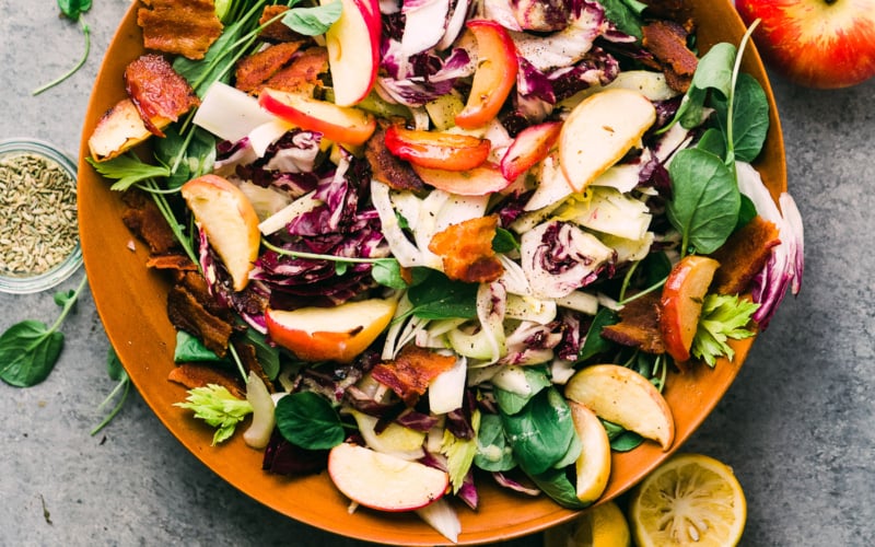 This salad is complex and sophisticated, but not above getting a sweet hit from the apples and an irresistibly salty crunch from bacon.