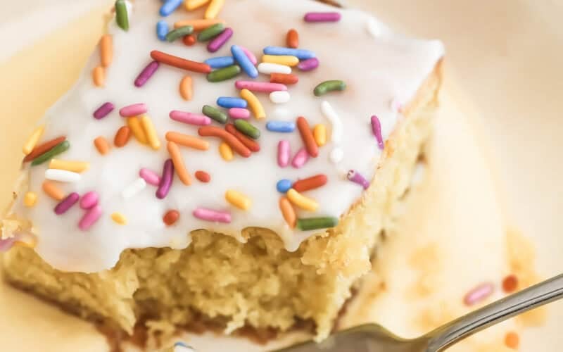 - Make the icing by stirring together the 1 1/2 cups confectioners sugar and 2 Tbsp milk or more as needed to form a smooth glaze. Spread over the cooled cake and let sit for a couple of minutes before adding the sprinkles. Let set before slicing.
