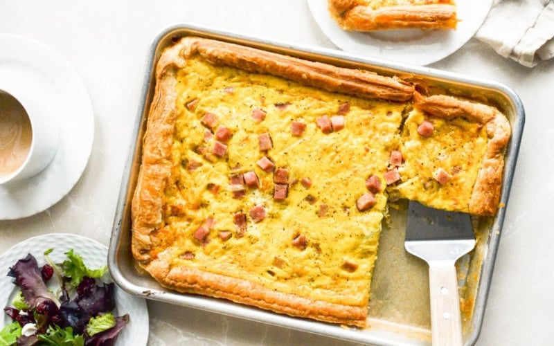 Imagine a classic quiche Lorraine style custard nestled into a crisp and flaky puff pastry crust! This fuss-free quiche in a sheet pan combines the best features of a classic quiche with a rustic tart. I love it for everything from work-from-home lunches, holiday breakfasts, and super elegant brinners. It rounds out a breakfast or brunch spread beautifully, but also holds its own as a light meal paired with any simple salad you like. The classic combo of smokey ham and nutty gruyere cheese doesn’t disappoint, either.