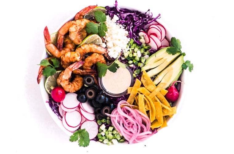 Shrimp Taco Salad is a stunning main course salad with jumbo Mexican spiced grilled shrimp, homemade tortilla strips, house pickled red onions, and all the fixings on a bed of zesty red cabbage slaw. You’re not going to want dinner to end.