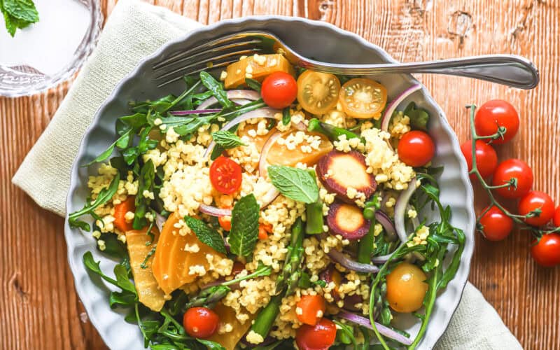 We love this millet salad recipe! It’s a new grain salad for my collection, and it happens to be gluten free. I use beets, rainbow carrots, skinny asparagus, cherry tomatoes and baby arugula for a fresh spring theme.