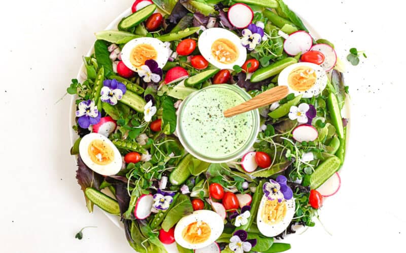 spring salad wreath with eggs, and creamy basil buttermilk dressing.