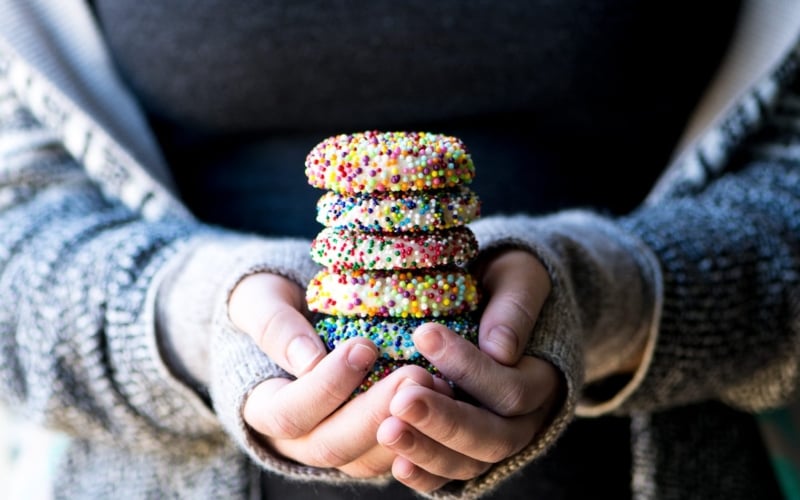 I’m definitely a go big or go home type when it comes to sprinkles, and I like to pile them on, but getting those little guys to stick can be a challenge! When cookies bake, they expand, and the sprinkles spread out leaving gaps. Here are a few tips for getting that fully sprinkled look that everybody loves…