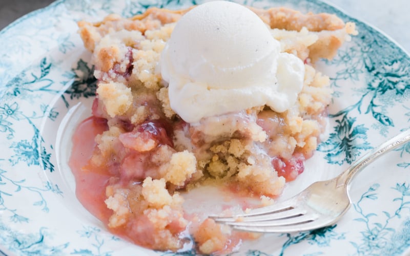 Vanilla bean paste adds a warm flavor to this strawberry rhubarb crumble pie