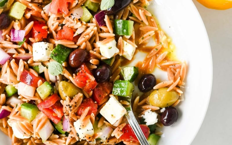 GO PLANT BASED: for a vegan toasted orzo salad use a plant based feta (or make it yourself.) Omit the honey in the dressing and add sugar, agave syrup or date syrup.