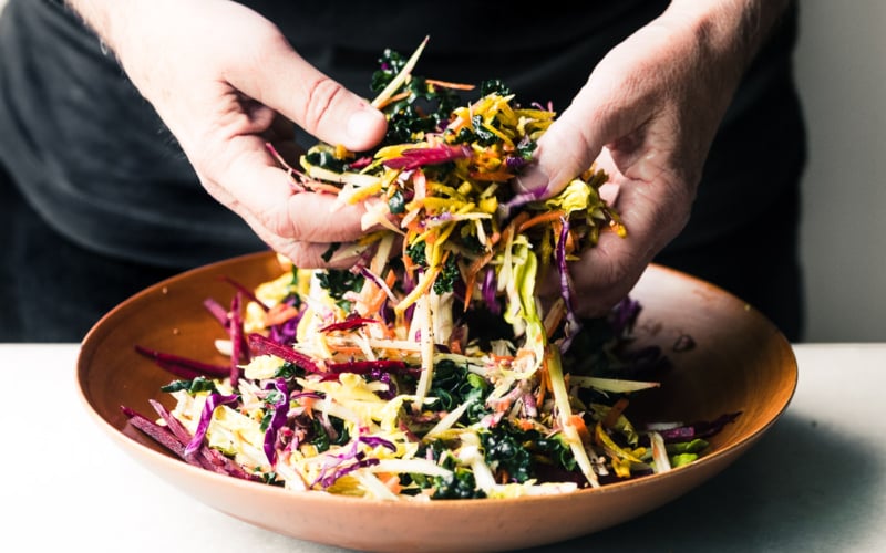 There are a few ways you can shred your slaw…when it comes to cabbage and kale you can slice it very thinly with a large sharp knife and then cut it into shreds. But for really dense vegetables like beets you’ll need to use either a food processor with a shredding disk, or a mandoline slicer that has a shredding setting. Just be sure to use the protective guard, especially with hard veggies like beets.