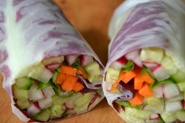 You just soak them for a few seconds in water to soften, and then wrap them around whatever filling you choose. I love how the inside shows through the translucent skin. Then when you cut them, either straight across or on a diagonal, you get a beautiful surprise mosaic of vegetables.