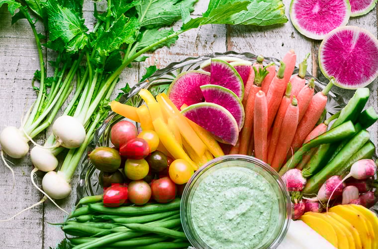 Even if you’re not throwing a party, I love to pack prepped veggies like this with the dip for healthy snacks. Packed in small storage containers, covered with a damp paper towel, they’ll keep for days in the fridge.