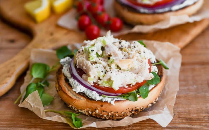 - Serve on toasted bagels: spread a generous layer of dilled cream cheese on the bottom, then top with a thin slice of onion, a thin slice of tomato, and then a scoop of your whitefish salad. I like to finish with fresh cracked black pepper.